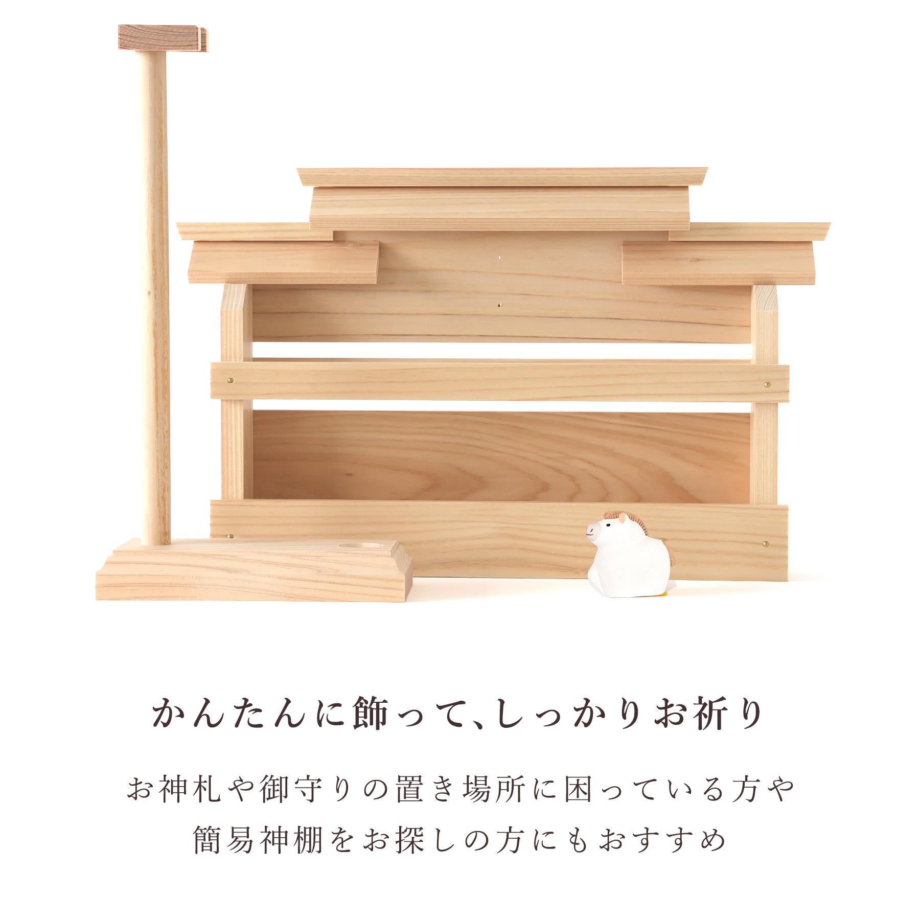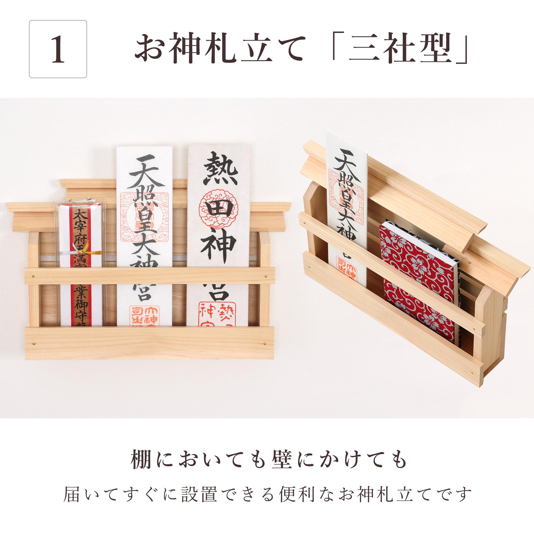 お神札立て「三社型」シンプルな三社宮のデザイン。本体は御札を入れても左右に傾かない構造となっており、美しくお祀りできます。据え置きでも壁掛けでも使用も可能。届いてすぐに設置できる便利なお神札立てです。工具等は使わずアッという間に、簡単に取り付けられるお神札入れ。壁面の状態に対応するようピン釘が2種類と取付け専用パーツが付属します。 石膏ボード壁、合板壁、柱や鴨居などに設置可能。 取り外しても跡は目立ちにくく、賃貸のお部屋にもお勧め。 小振りでも工房の職人が心を込めて作成した、紀州産・総ひのき製となっています。 |