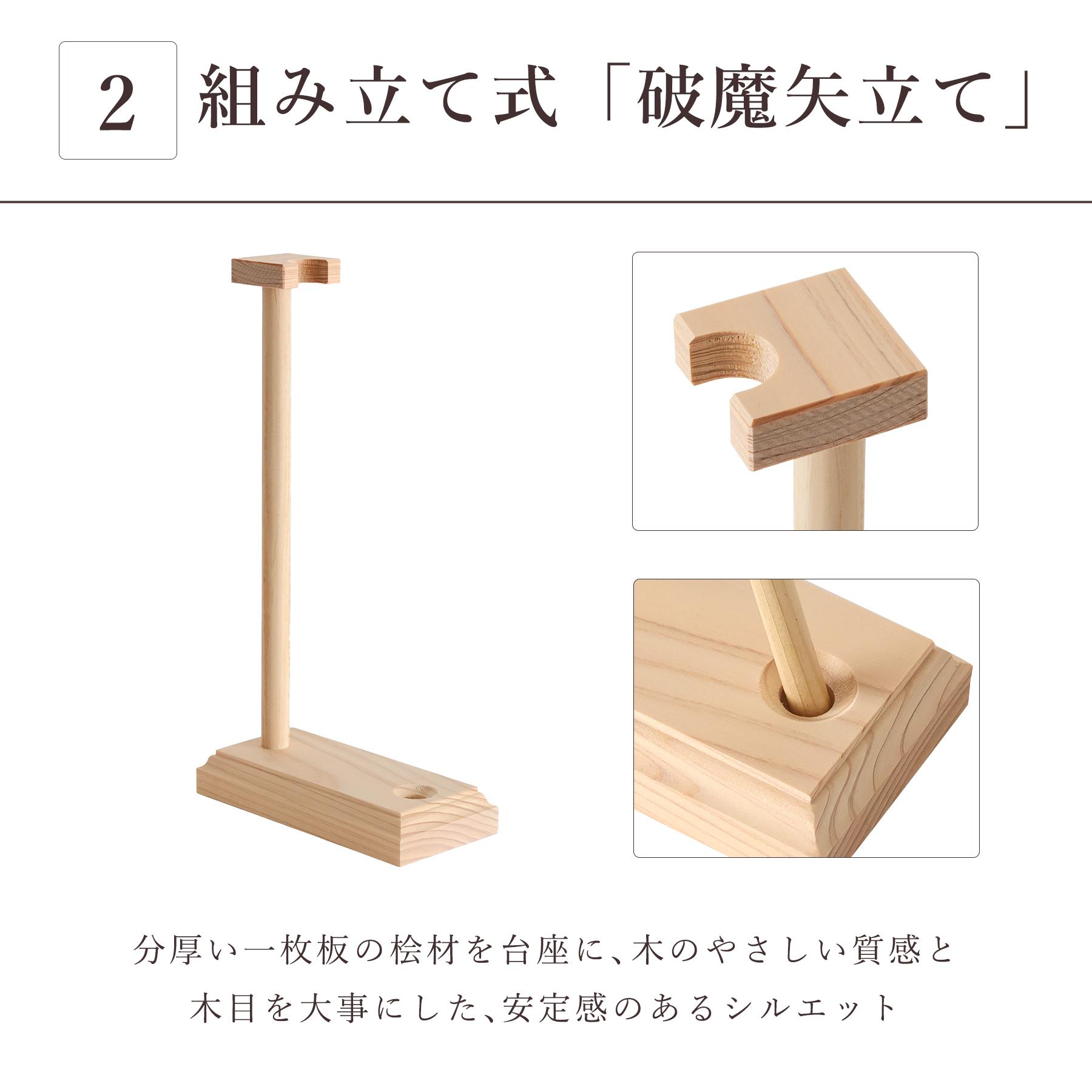 破魔矢立て紀州ひのき材(三重県南部〜和歌山県産)を使い、工房の職人たちが心を込めて作成しました。縁起物の破魔矢を美しくお祀りします。台座部の受け穴は、2段のすり鉢状になっており、矢の先の様々な形に対応して滑らない構造となっています。破魔矢の一般的な長さである45〜65cmの破魔矢を立て掛けることができます。 分厚い一枚板の桧材を台座に、木のやさしい質感と木目を大事にした、安定感のあるシルエットです。 |