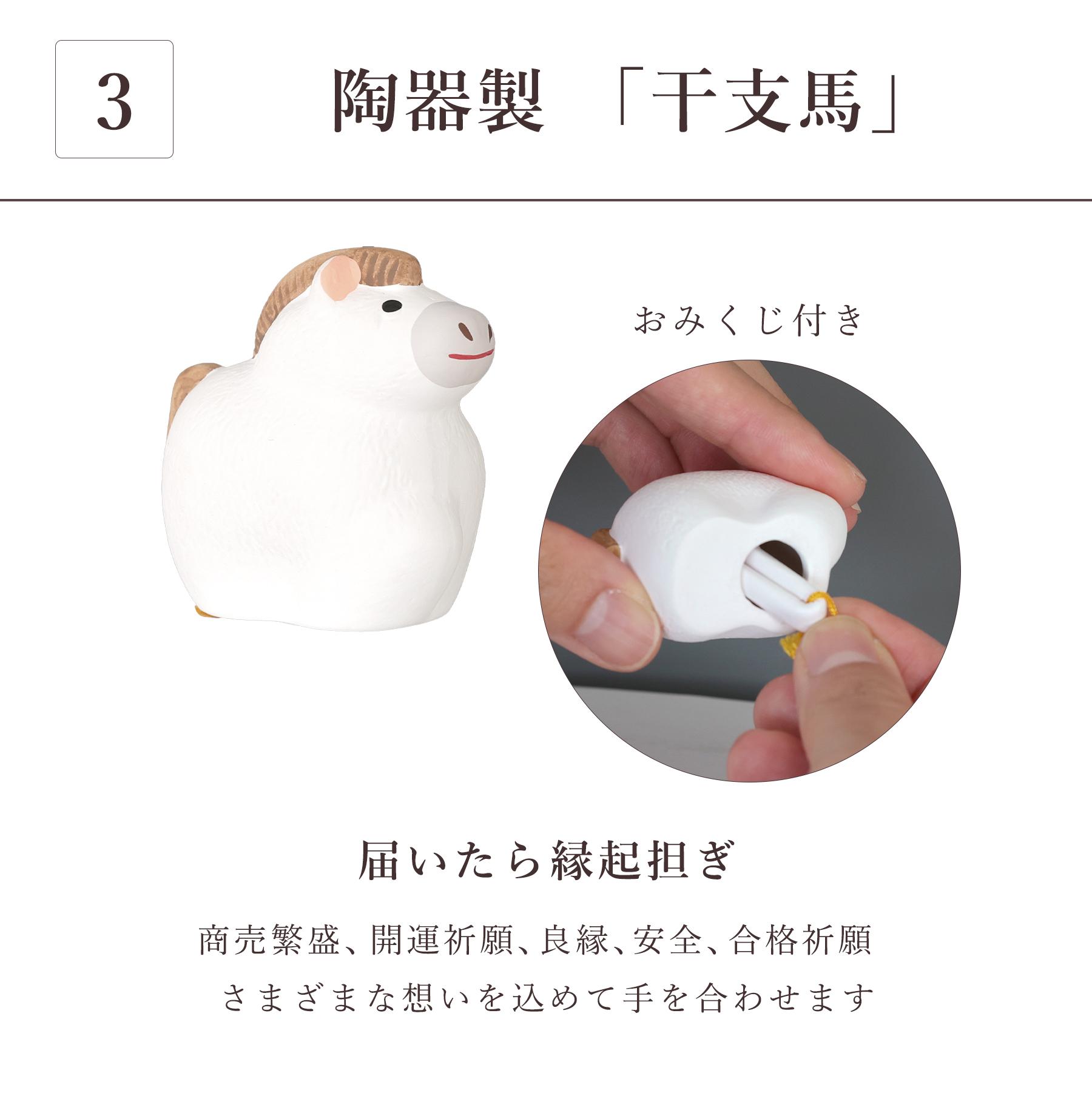 干支馬陶器製の干支馬は、おみくじが付属しています。届いたらまず縁起担ぎ!商売繁盛、開運祈願、良縁、安全、合格、さまざまな想いを込めて手を合わせます。 |
