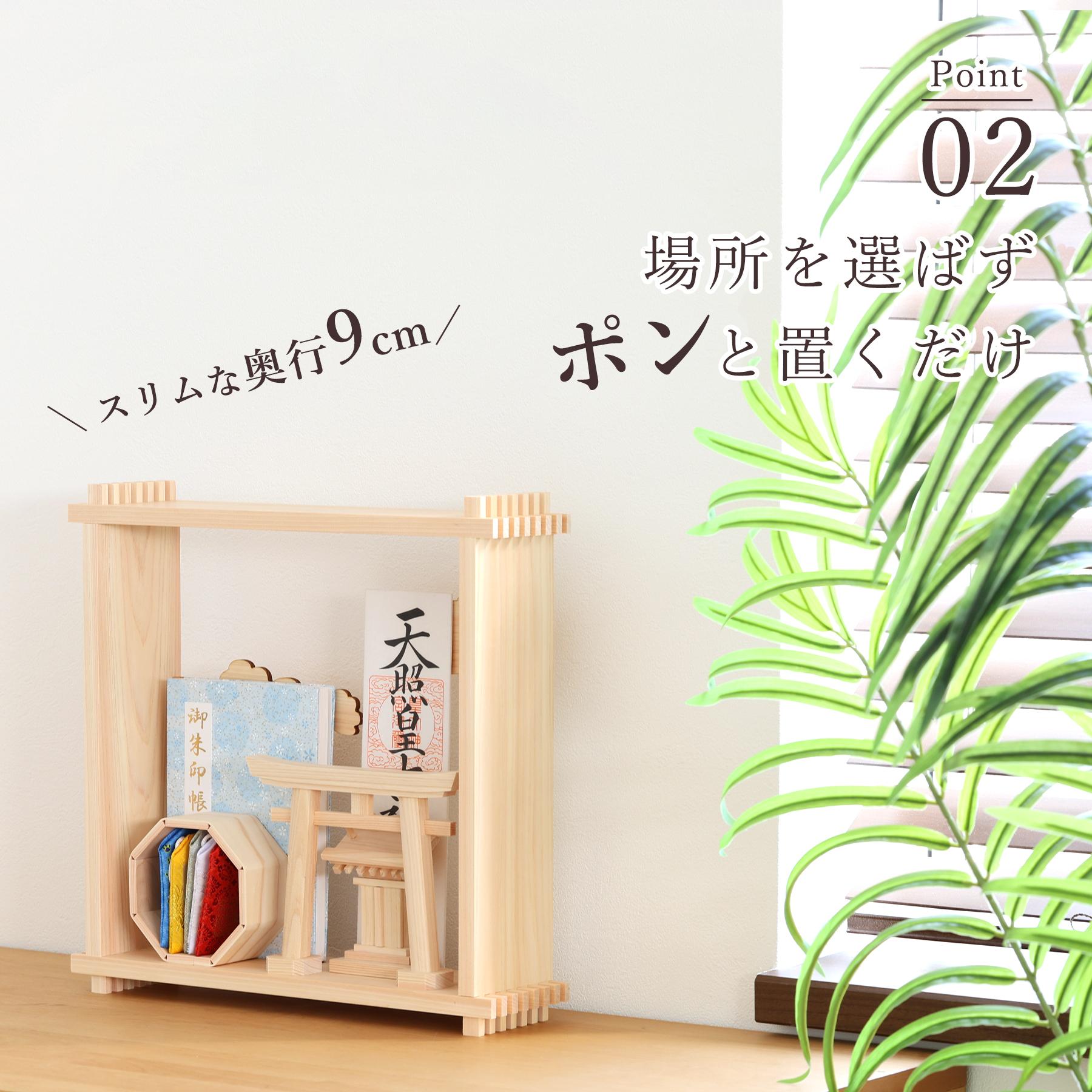 工具不要で石膏ボードの壁にも簡単に取り付けられます。<br><br>軽量設計で、女性一人でも約5分で設置完了。<br><br>さらに、狭いスペースでも圧迫感なく祀ることができ、模様替えや引っ越しの際もラクラク移動可能です。