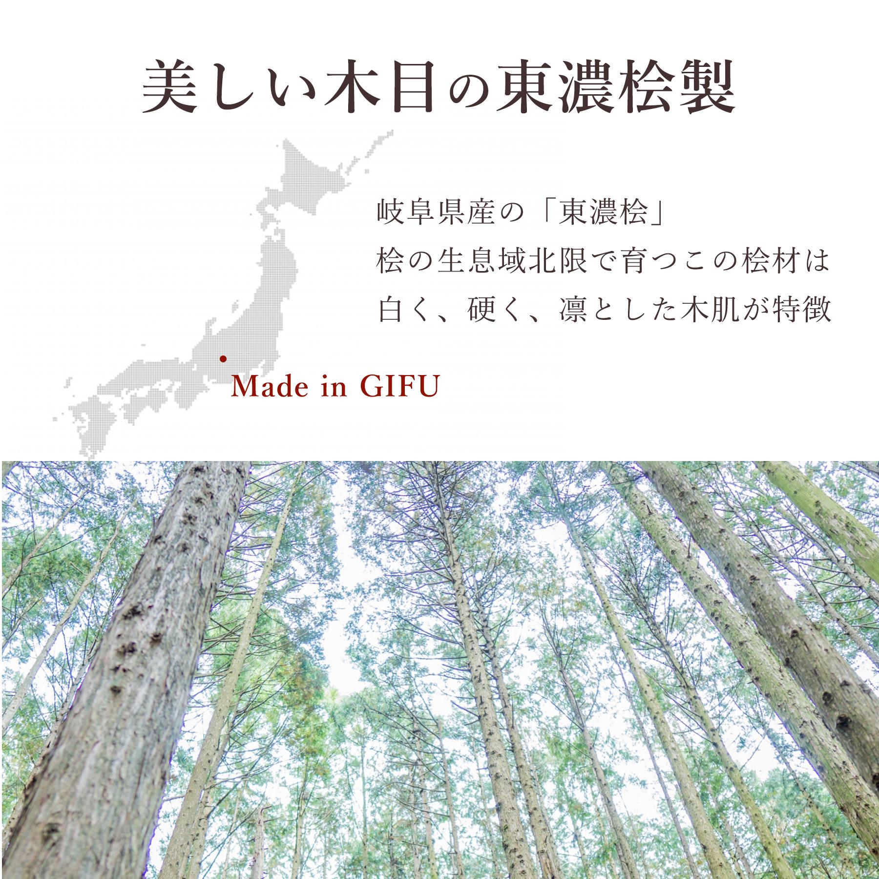 岐阜県産の東濃ひのきを使用し、耐久性と美しい木目を提供します。