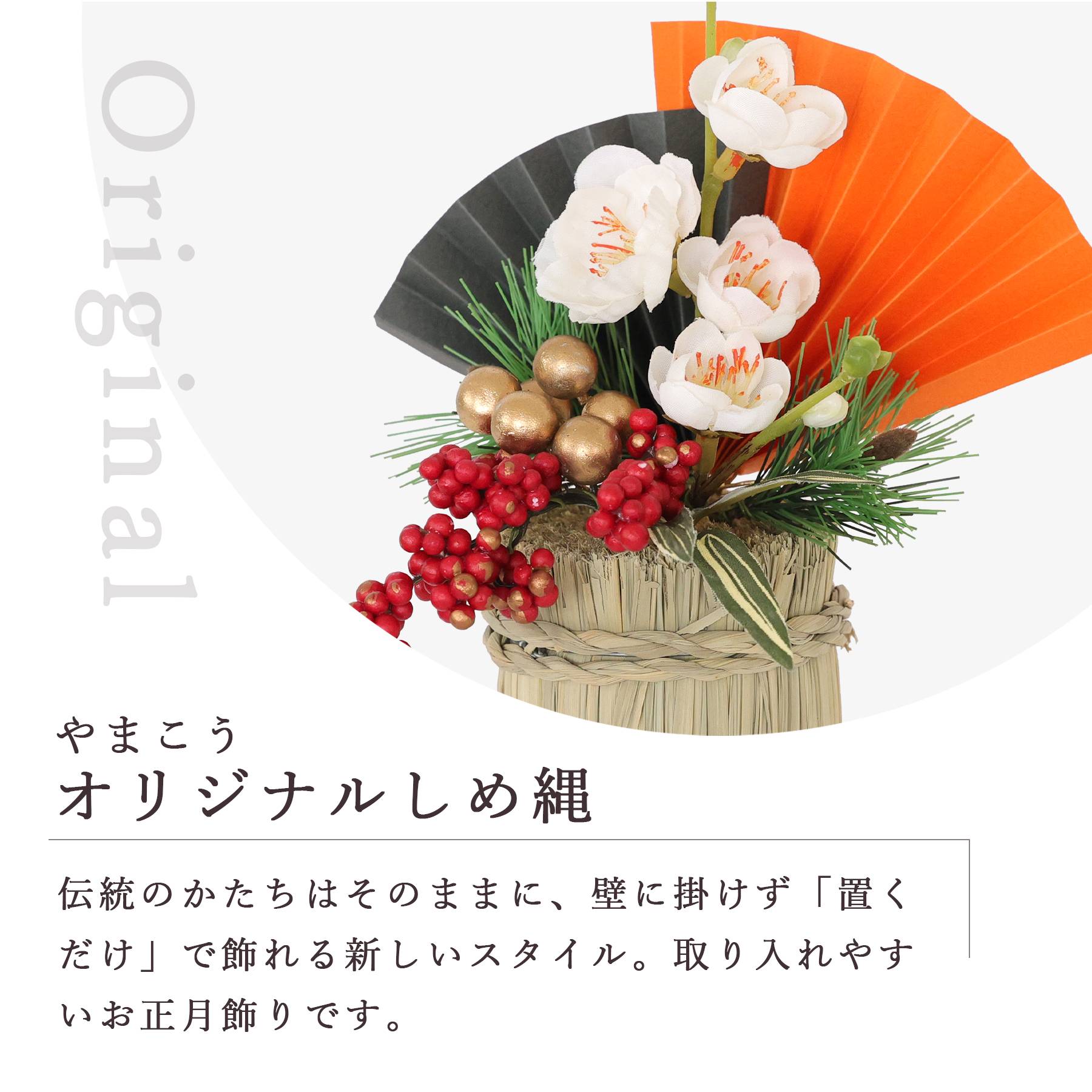 やまこうのしめ縄飾りは、壁に掛ける必要がなく、玄関や棚の上などに“置くだけ”で飾れる新しいスタイル。<br>