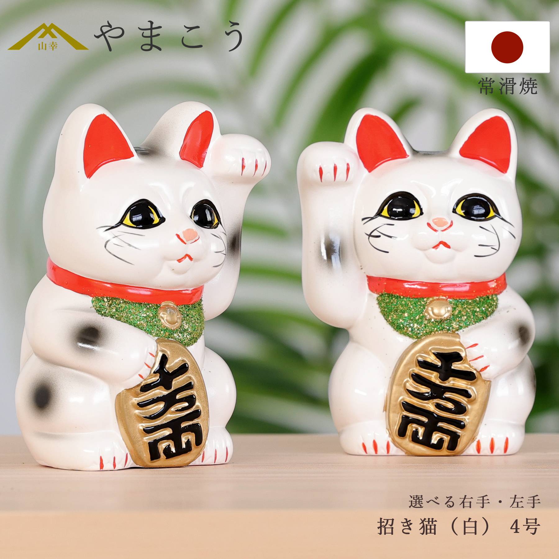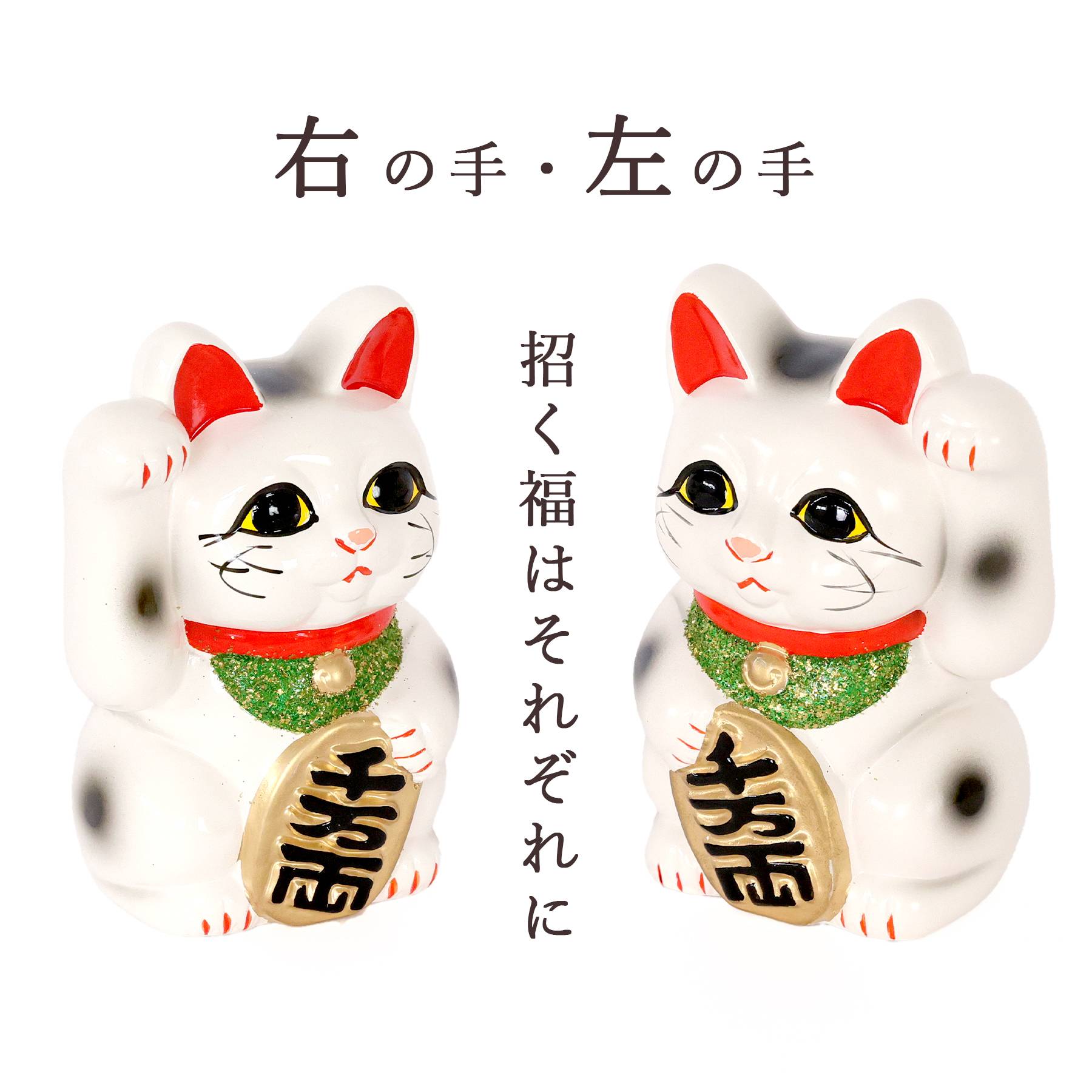 右手を挙げた猫は「金運・商売繁盛」、左手は「人やご縁を招く」と言われ、願いや用途に合わせてお選びいただけます。 |