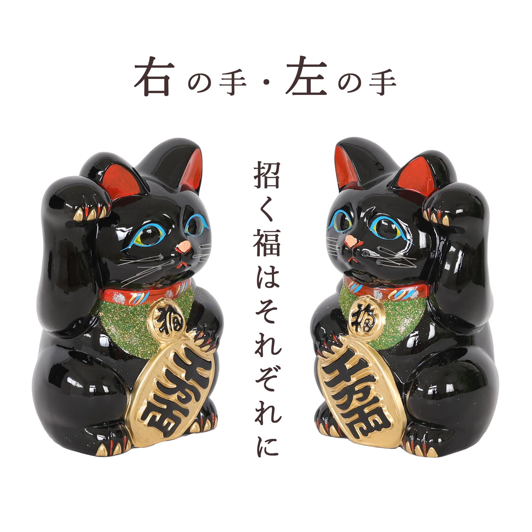 右手を挙げた猫は「金運・商売繁盛」、左手は「人やご縁を招く」と言われ、願いや用途に合わせてお選びいただけます。 |