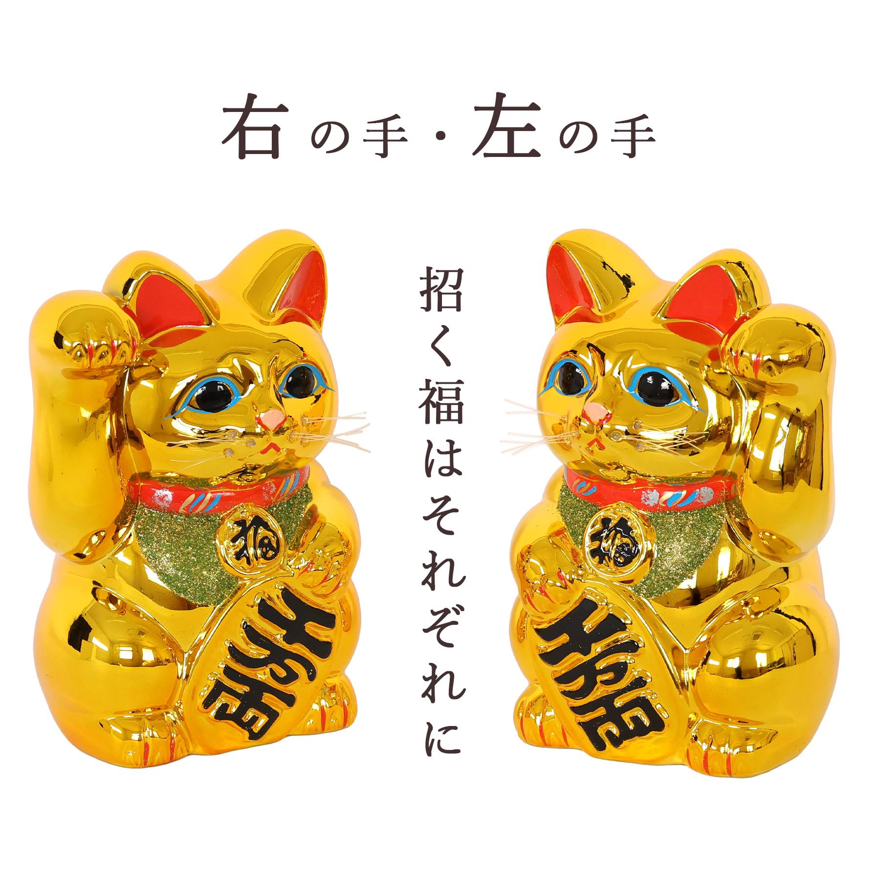 右手を挙げた猫は「金運・商売繁盛」、左手は「人やご縁を招く」と言われ、願いや用途に合わせてお選びいただけます。 |