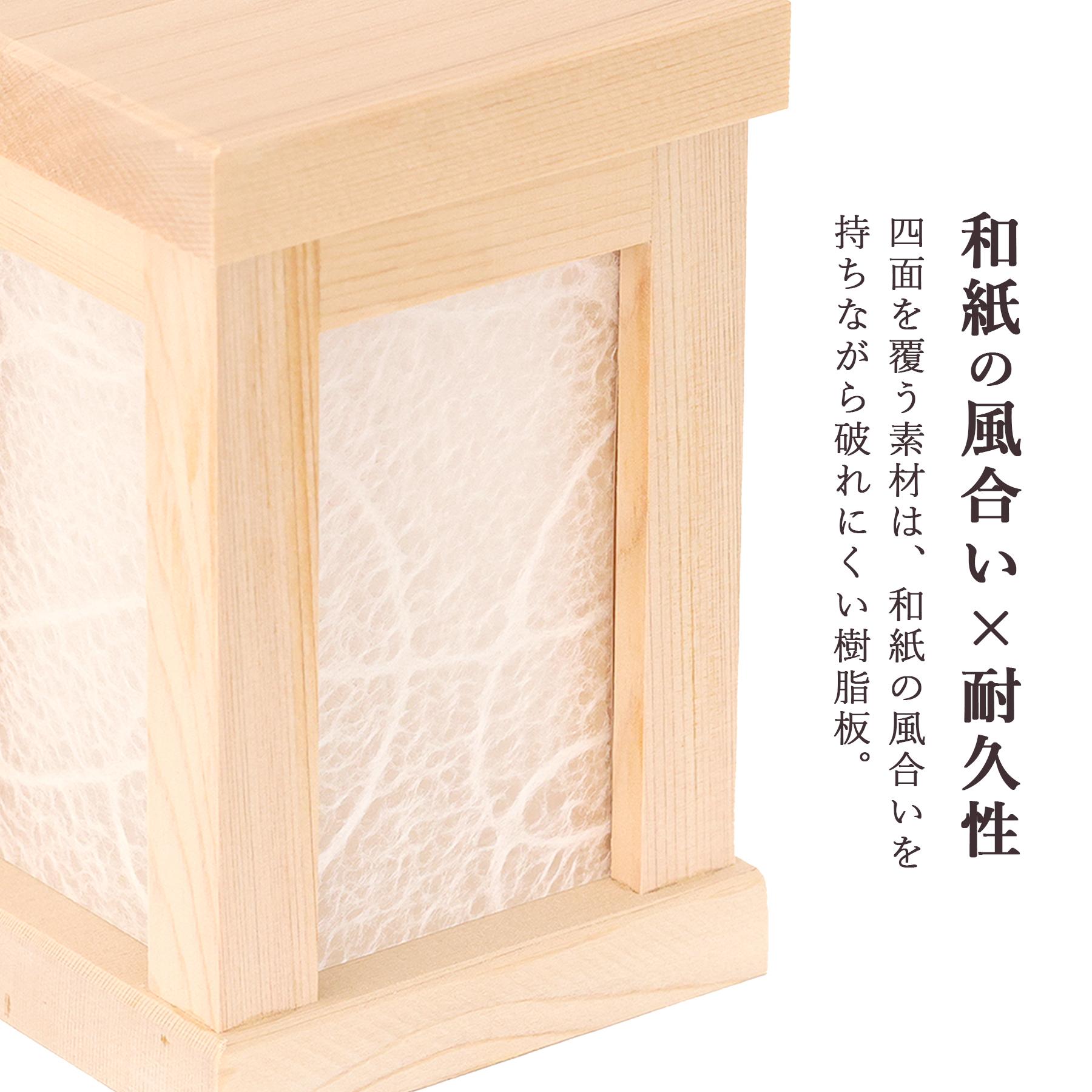 四面には、和紙の風合いを再現した樹脂板を使用しています。<br> 和紙らしいやさしい見た目を保ちながら、破れにくく、日常的に扱いやすい仕様です。