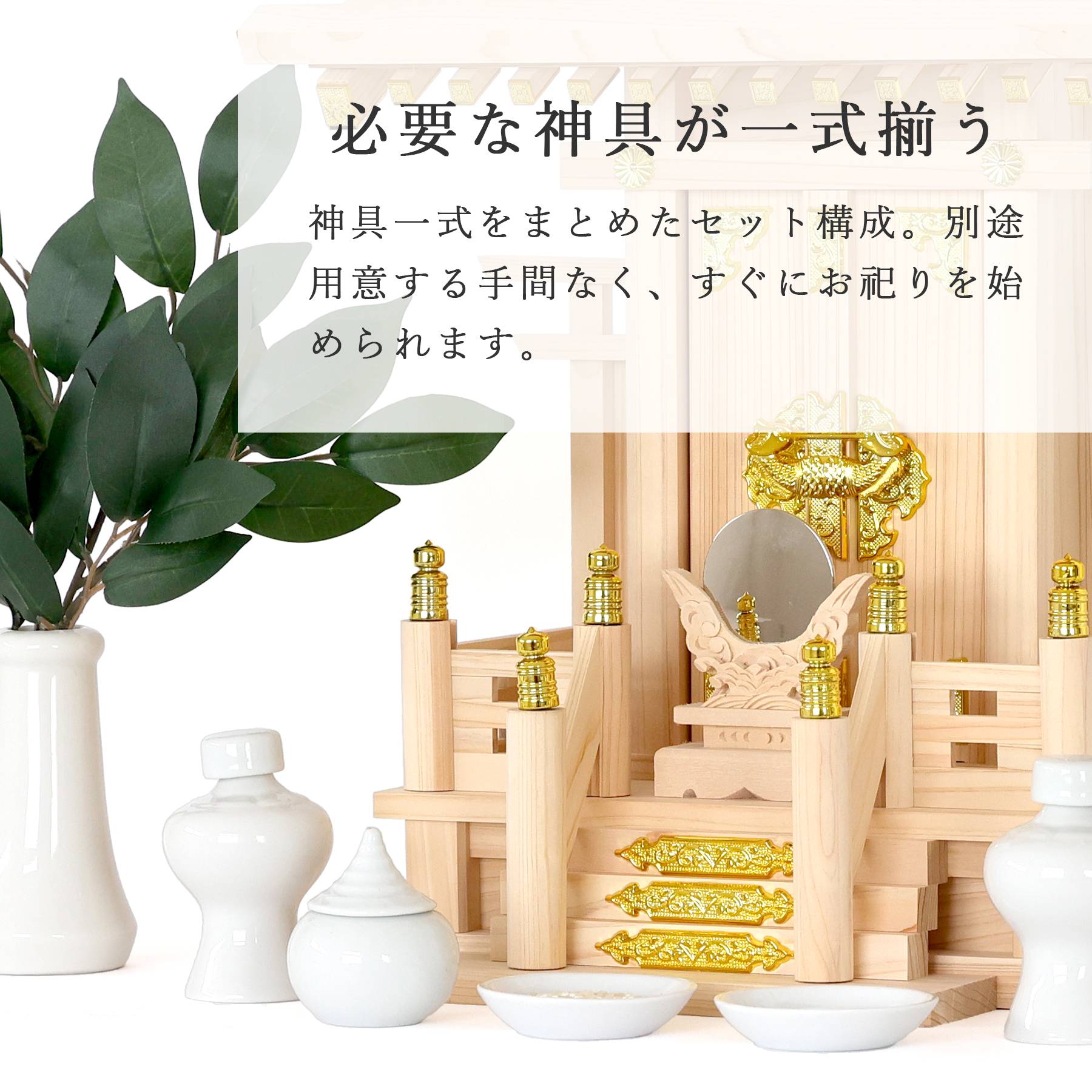 神鏡・榊立て・瓶子・皿など、基本の神具も一式セットになっているため、