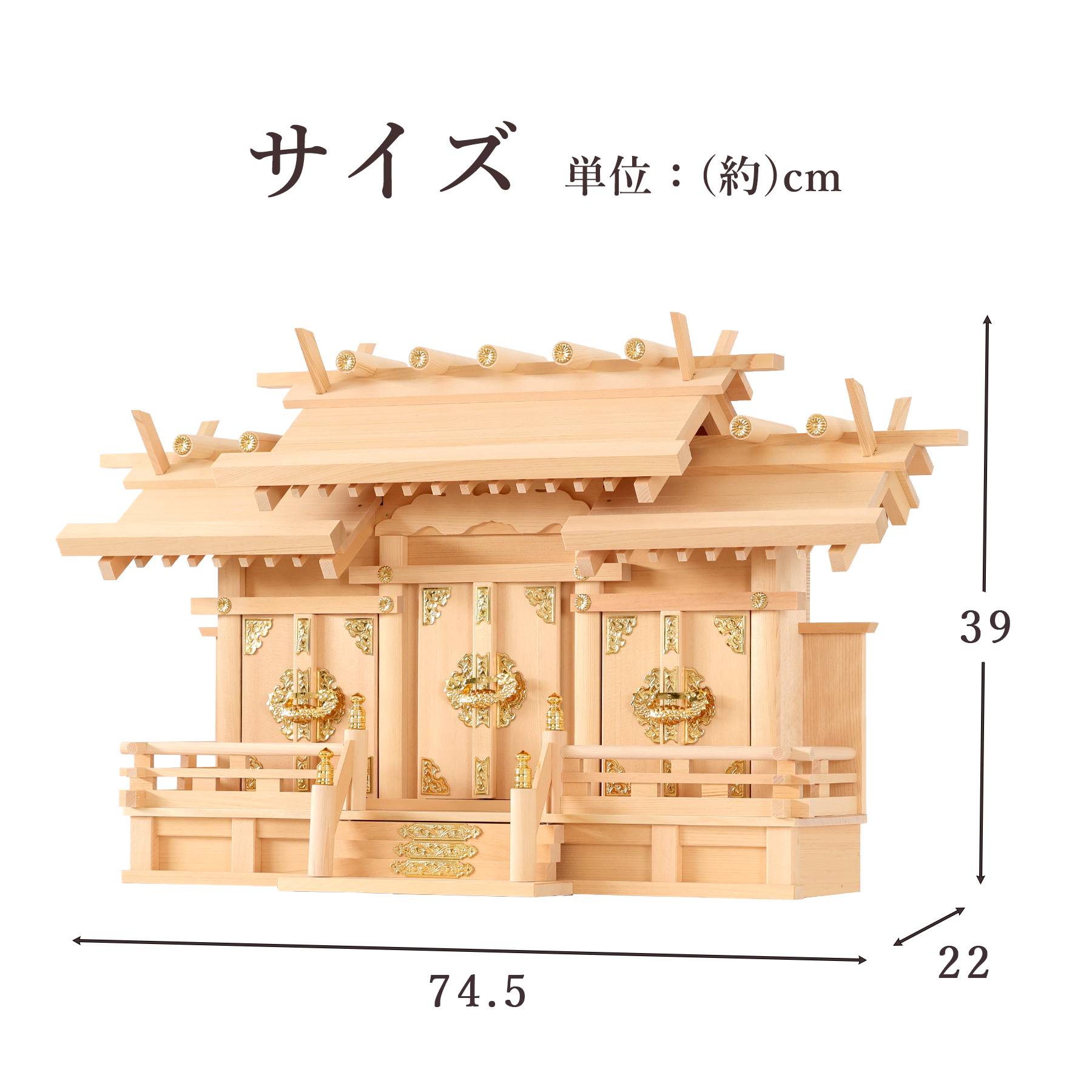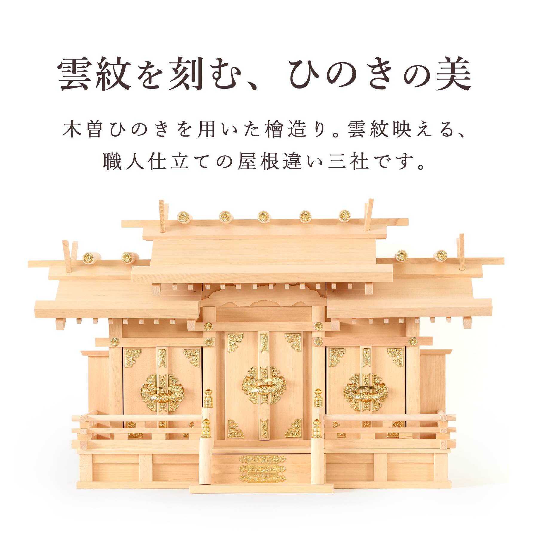 【匠造り 木曽ひのき】真鍮の輝き 低床型 屋根違い 三社 大型 白無地神具セット