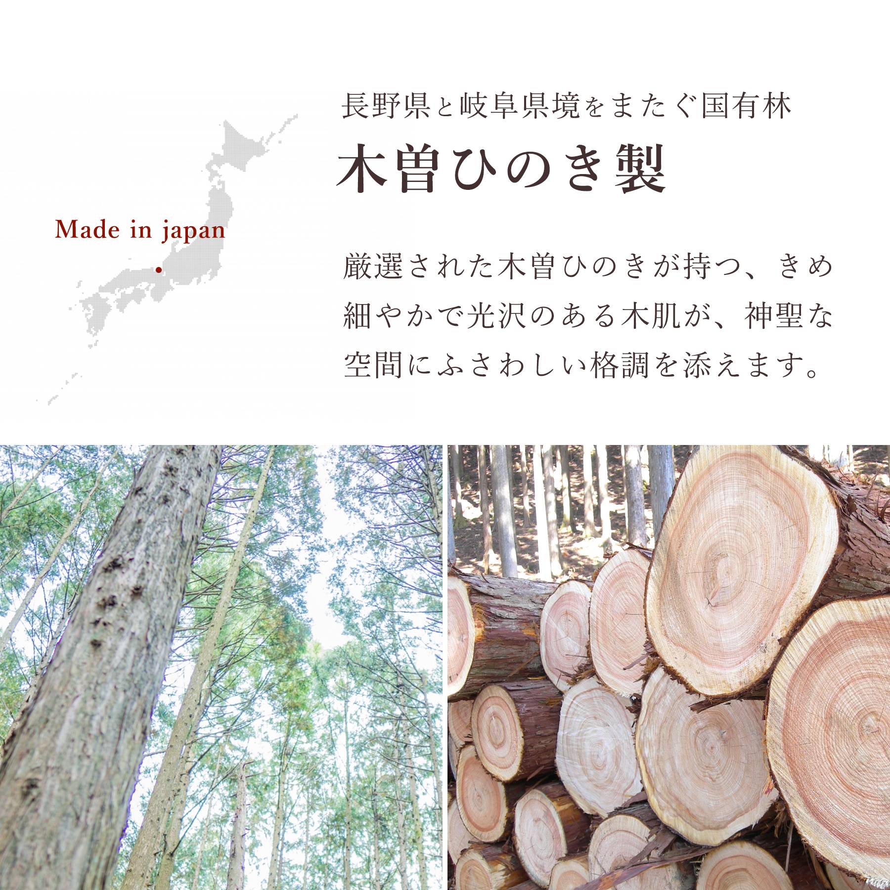 「尾州桧」「官材」等とも呼ばれる希少な木曽ひのき材は、神棚用としては最高級品のみに使用されます。<br>