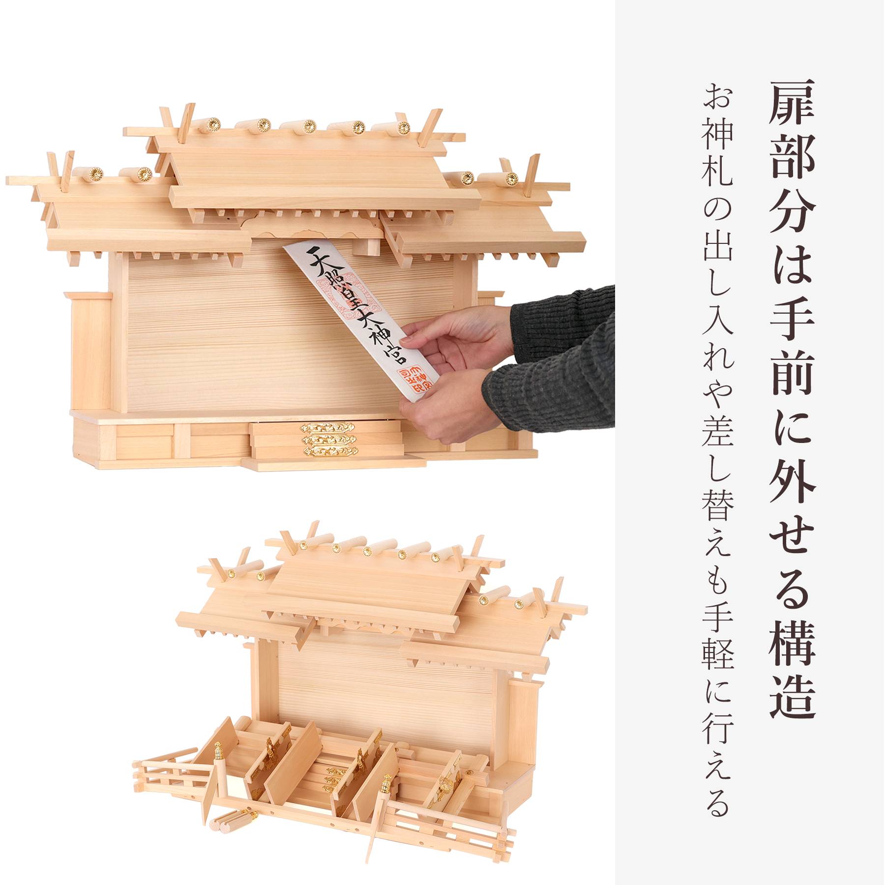 少しサイズの大きいようなお神札でも、扉を外すことで手軽にお収めいただけます。<br>