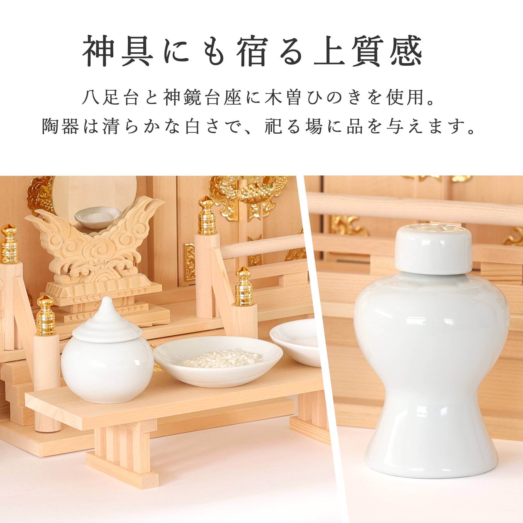 八足台と神鏡台座にも木曽ひのきを使用。陶器は清らかな白さで、祀る場に品を与えます。