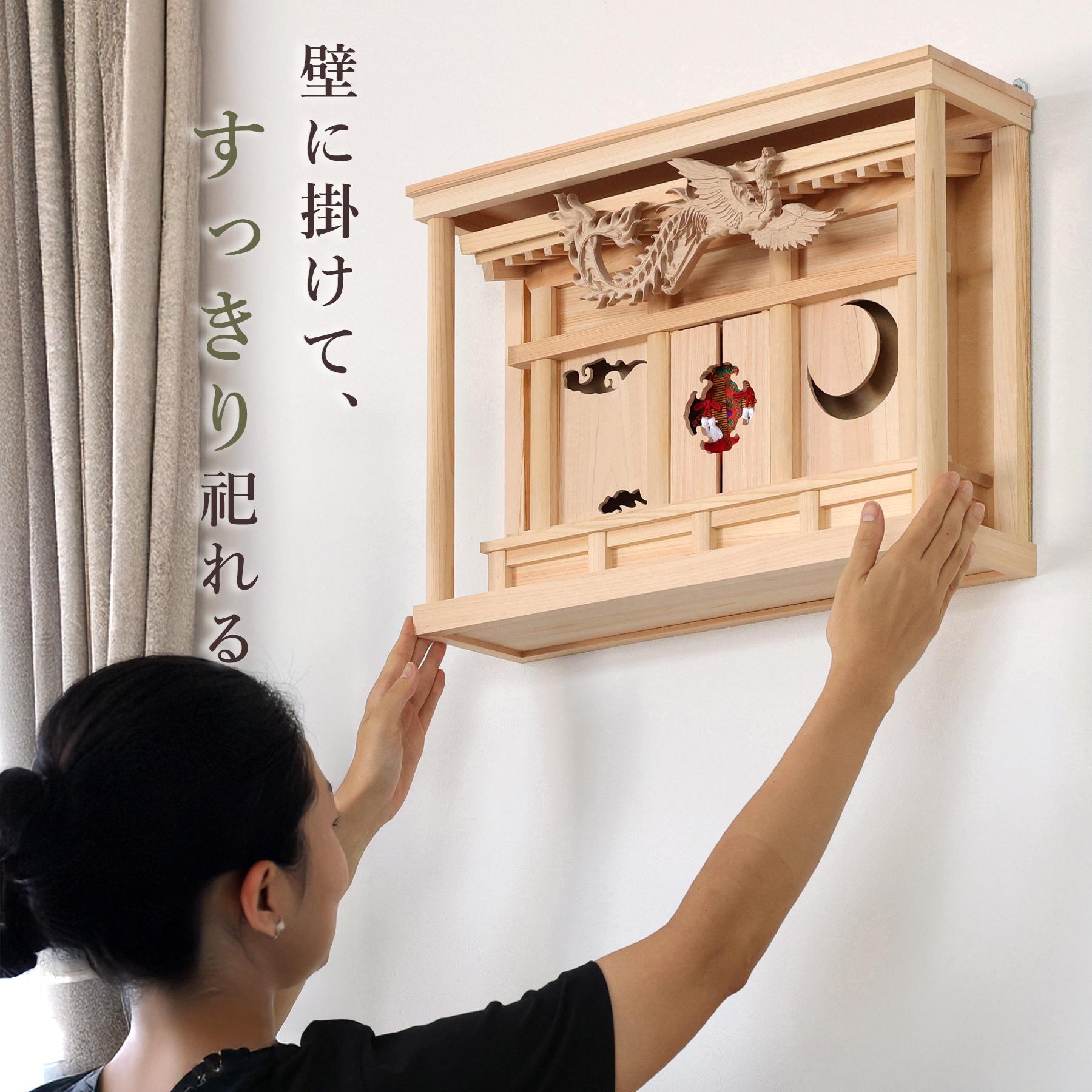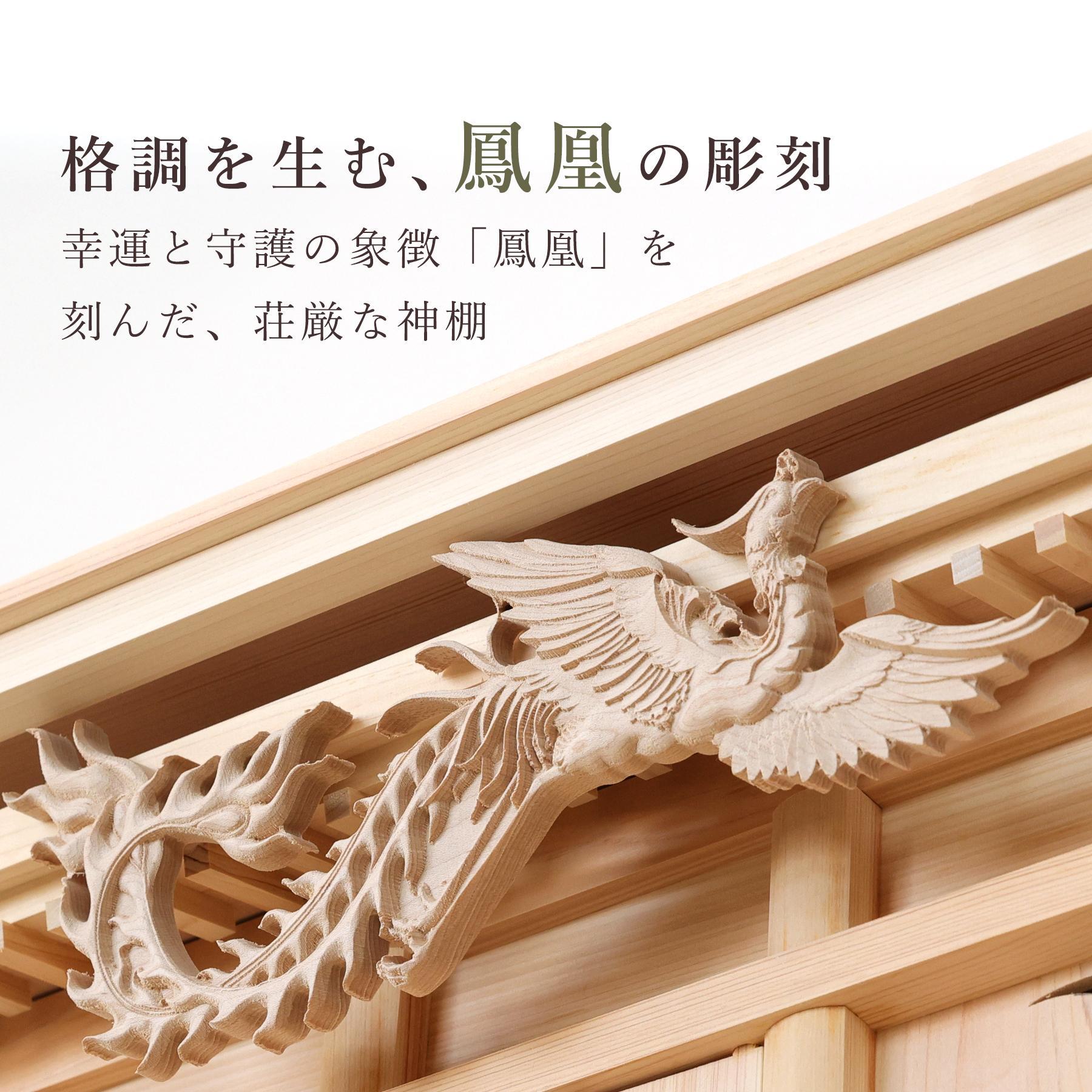 鳳凰が宿る、神宮大社の趣きお社には、力強く優しく見守りくださる「鳳凰」が宿っています。天空を舞う不死鳥、永遠を表す象徴を細微な彫刻で表した、美しい神棚。奥行きを抑え、壁に掛けられるモダンなシルエットは、お神札を丁寧にお祀りする「箱宮」の新しいカタチ。 | ![]() |