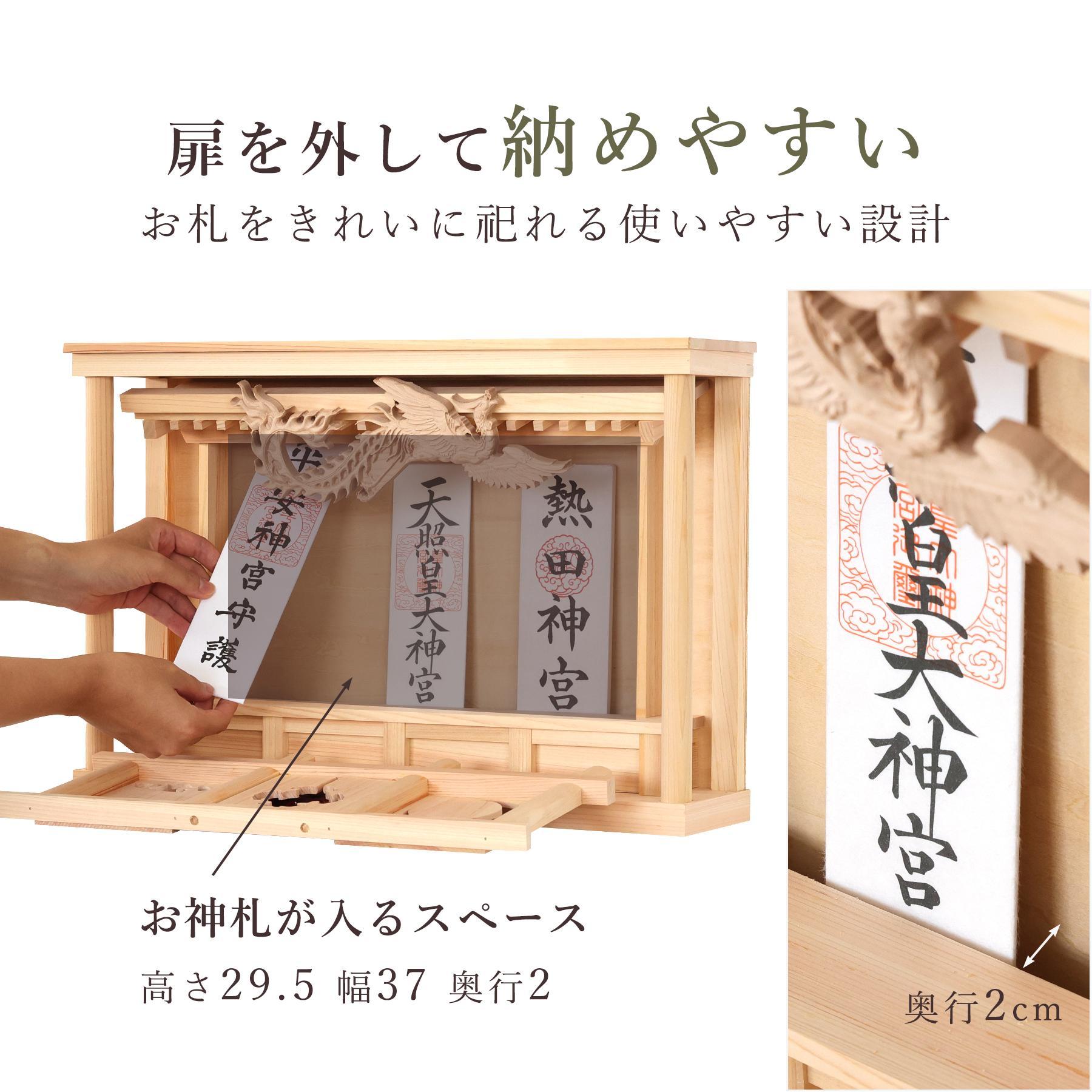 節目に合わせて、豪華に3枚までのお神札が収めやすい、三社宮の形構造となっています。一般のご家庭から店舗、事務所、会社などに適した、存在感のあるサイズ。壁掛け用フックが背面上部に付属しています。皆様の門出に合わせて華やかで豪華な祭壇を。「龍神」の彫刻をあしらった、同モデルの製品もございます。 |