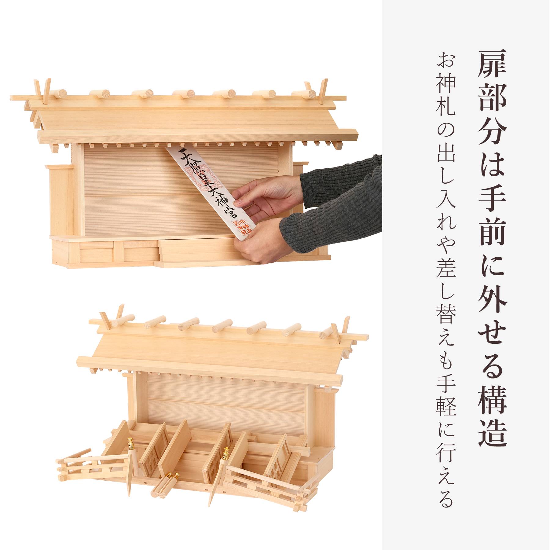 少しサイズの大きいようなお神札でも、扉を外すことで手軽にお収めいただけます。<br>