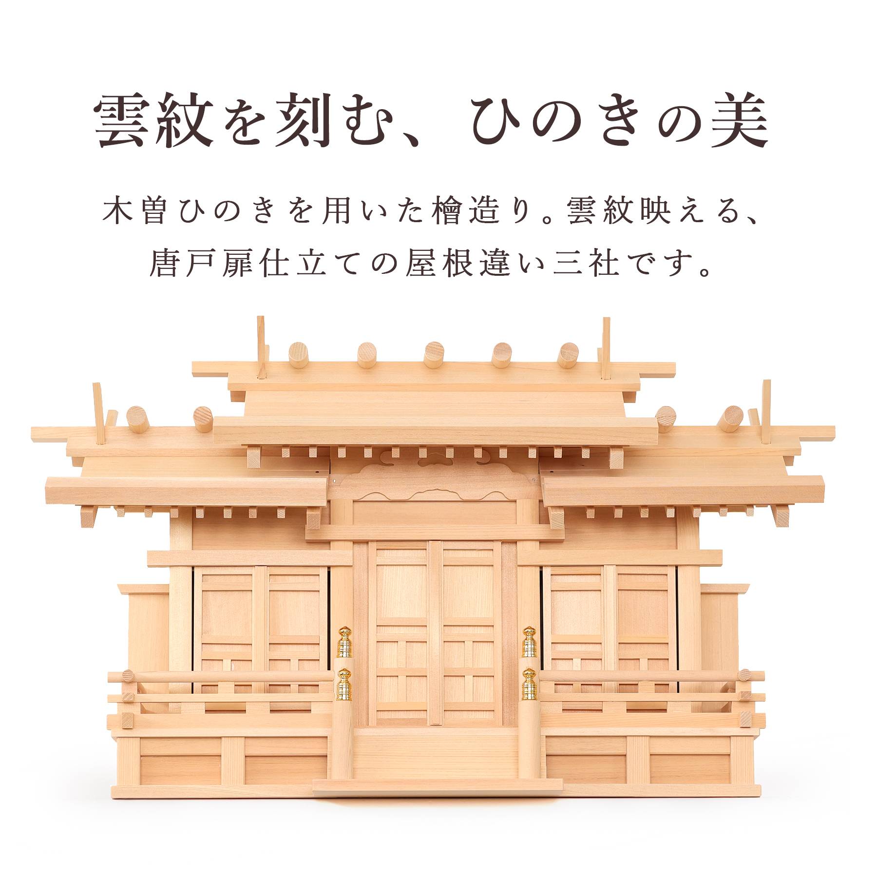 中央扉の上部に雲紋の意匠が映える、職人仕立ての屋根違い三社です。