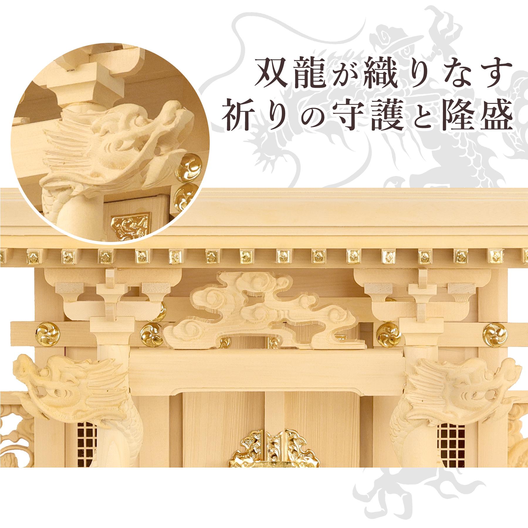 彫刻をちりばめた、神棚風神雷神と双龍の彫刻、天界の神々をイメージした美しく壮大なお社です。桧ではなく、年輪・木目がほとんど無い淡い単色のヒバ材で作られたお社。清楚で上品、工芸品のような趣き。神々に手を合わせ、悠久のご加護と平穏をお祈りいたします。 | ![]() |