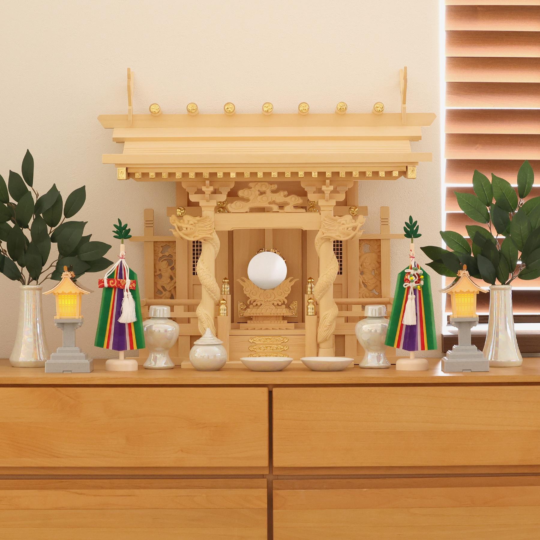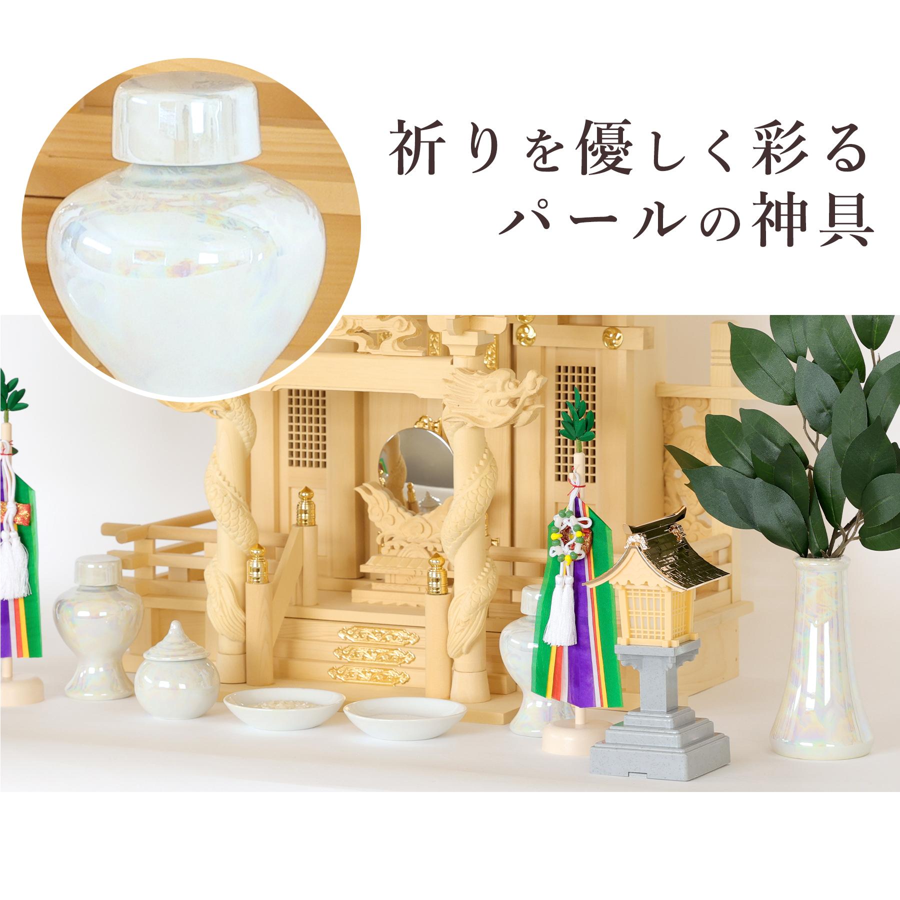 風神雷神龍神 一社 檜葉製 真榊 LED灯篭付き パール神具セット