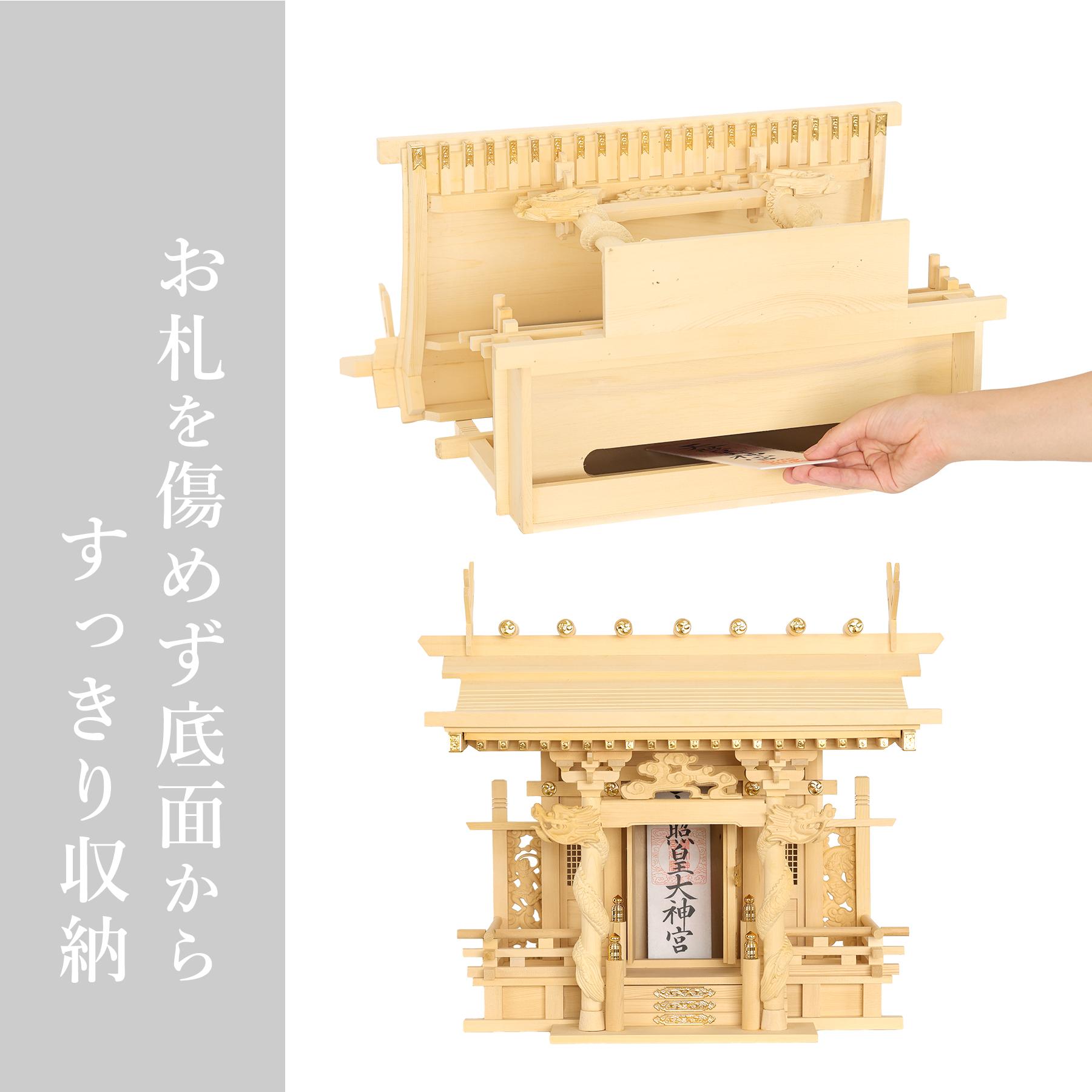 豪華「一社宮」神社から頂いた様々な大きさのお神札は、底面から差し入れる収めやすい構造です。神棚本体は、一般のご家庭から店舗、事務所、会社の応接間などに適した、立派で大きめのサイズ感です。 |