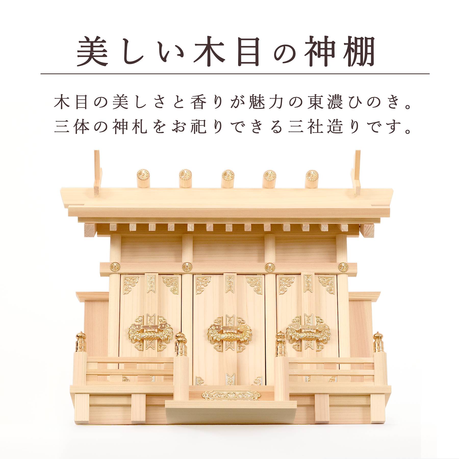美しい木目の神棚岐阜県・東濃地域、この地方で産出される良質な「東濃ひのき」は名の通った桧のブランド材。桧の生育域北限に近く厳しい寒さの中で育つため年輪は細かく、出来上がった製品は曲がりや狂いが少ないのが特徴。白身が強く、色目の均一感があるため、高品質な神棚製品に使用されています。 |