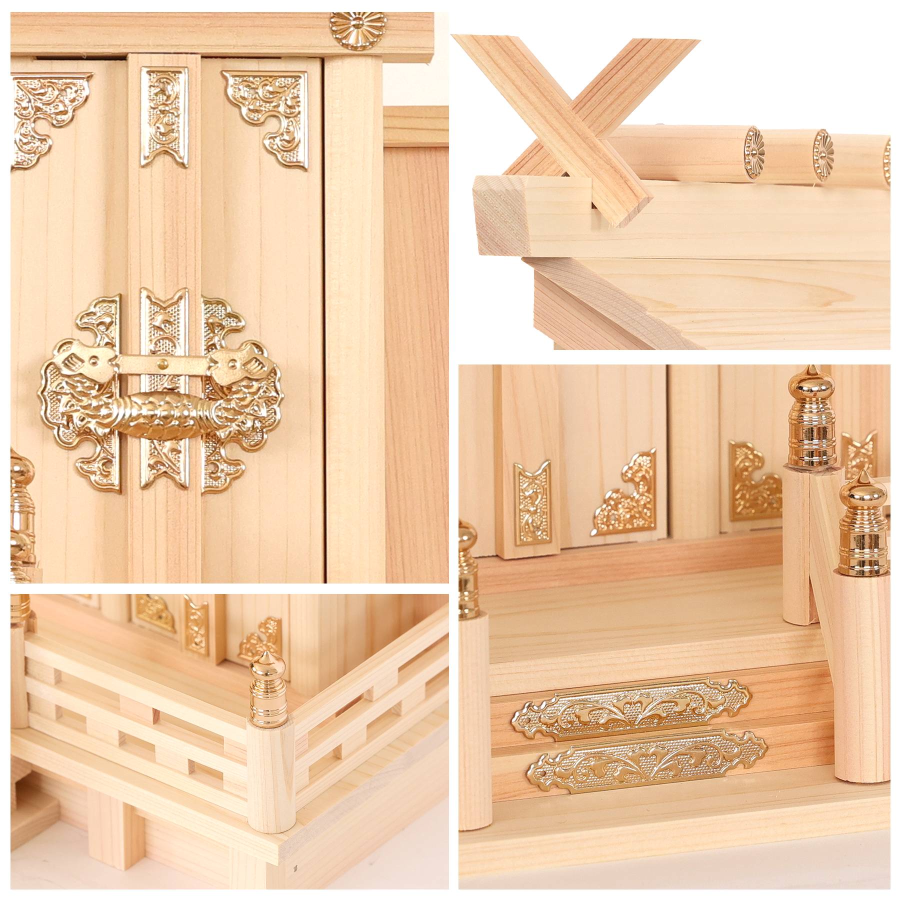細部に宿る職人技山間の歴史ある神棚工房、たくさんの職人によって、手間暇をかけて作られています。金色に輝く金具はプラスティック製ではなく、真鍮製。 伝統の技で仕上げた、端正なつくりです。 |
