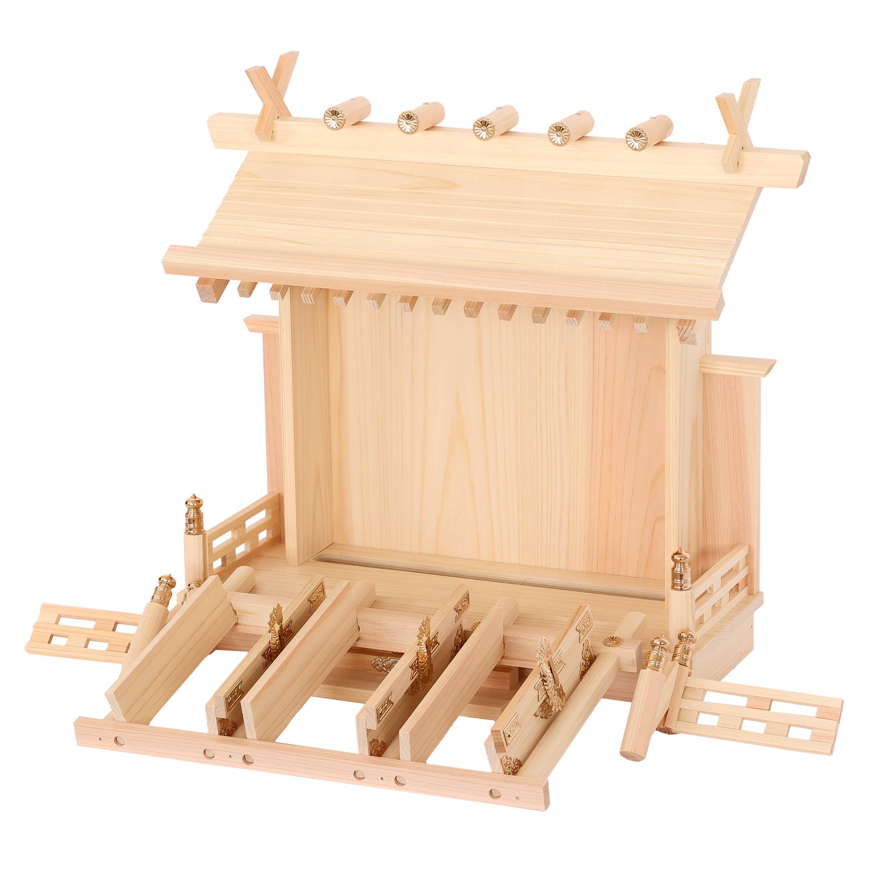 お神札の出し入れが手軽に扉と勾欄は取り外しが可能。少しサイズの大きいようなお神札でも、扉を外すことで手軽にお収めいただけます。 扉の下部両端を手前に引くことで簡単に取り外せます。 |