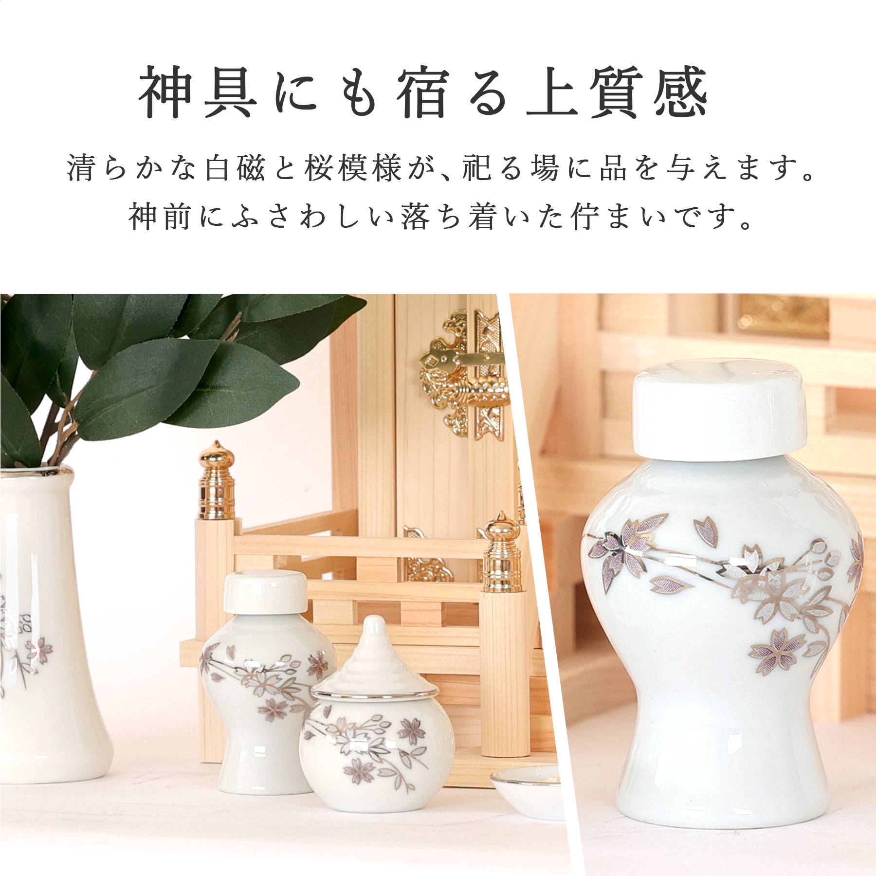 必要な神具が一式揃う神具一式をまとめたセット構成。別途用意する手間なく、すぐにお祀りを始められます。 陶器は清らかな白磁に桜模様が施されており、祀る場に品を与えます。神前にふさわしい落ち着いた佇まいです。 → 他セット一覧はこちら |