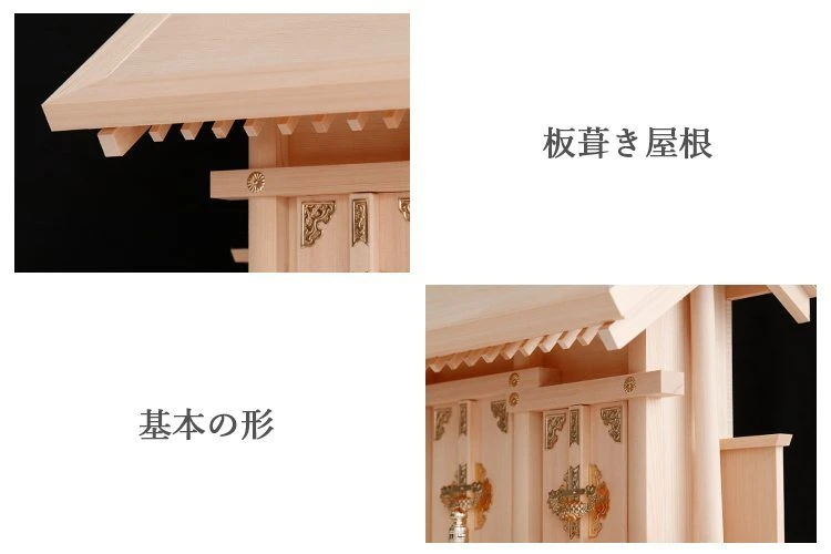屋根は木目が揃うよう職人が厳選し製造しています。<br><br>香り豊かな木曽桧に真鍮製の金具が映えます。<br><br>お神札の納め方は扉部分を外し正面から納める構造となっており、大きなお神札や木のお神札にも対応しています。