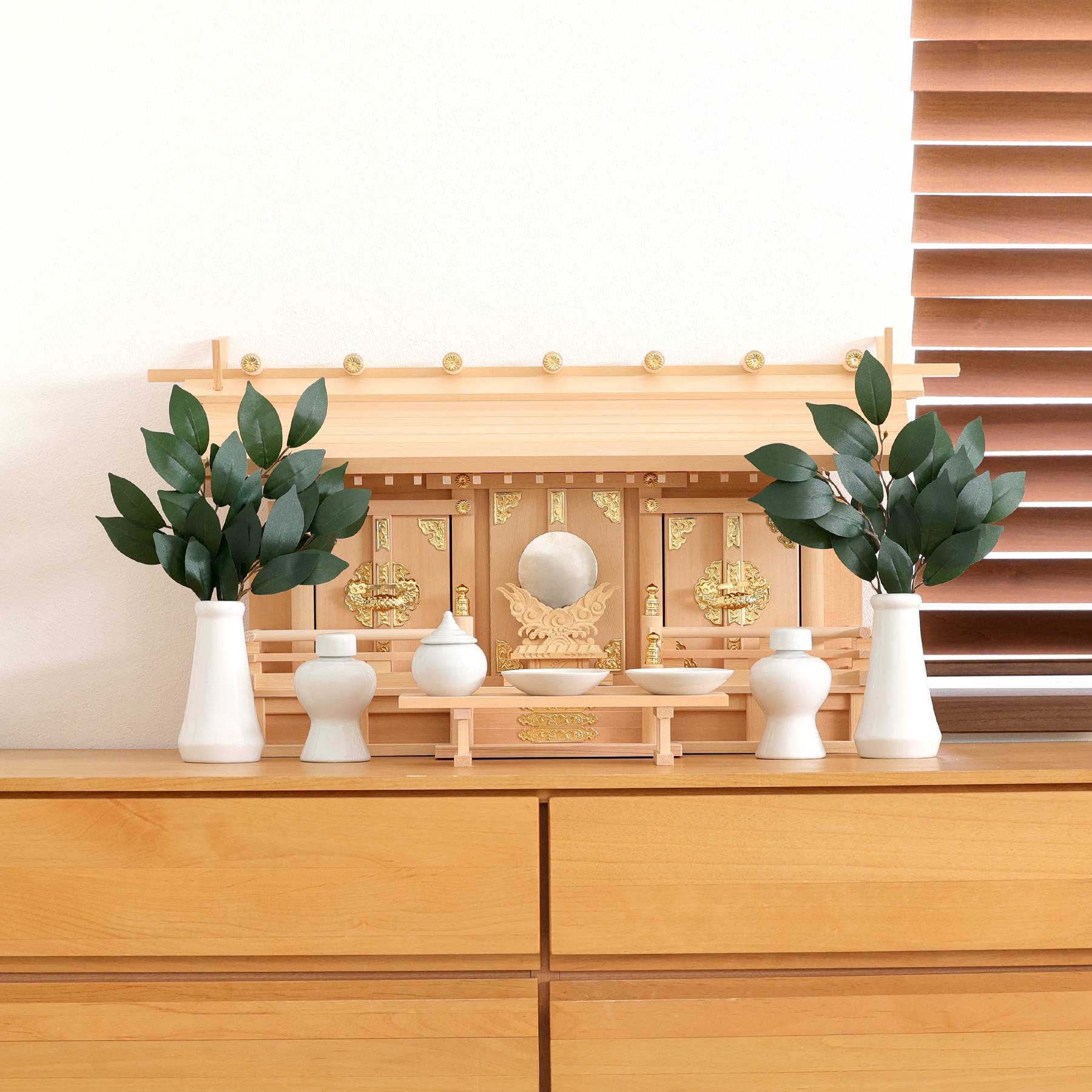 八足台と神鏡台座にも木曽ひのきを使用。陶器は清らかな白さで、祀る場に品を与えます。