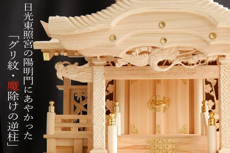 永遠不朽の平穏を祈願阿吽の龍柱には、日光東照宮の陽明門にあやかった「グリ紋・魔除けの逆柱」があしらってあります。「満つれば欠ける」の諺にちなみ、不完全な柱(逆柱)をあえて社殿に取り付けることにより、永遠不朽の平穏を祈願いたします。 お社の金具は真鍮とアルミ合金製、プラスチックを使わない、高級神棚ならではの装飾となっています。 |