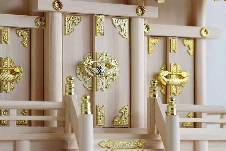 三社作りでお神札の収めやすい、基本的な神棚。御神木の産地として知られる東濃地方のヒノキ材を使用しています。