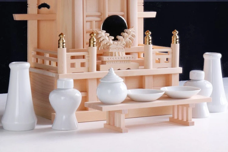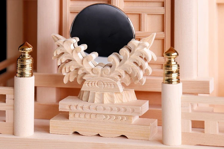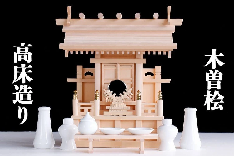 神鏡(台座:木曽桧)、八足台(木曽桧)、国産陶器セットが一式となった贅沢な神具付きとなります。