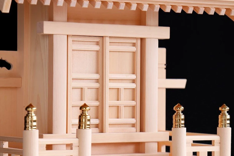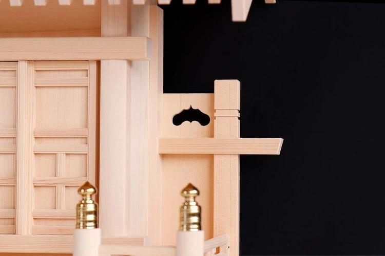 「美・木曽ひのき」シリーズ。上品な木肌と真鍮金具の落ち着いた輝きが高級神棚ならではの趣を演出しています。