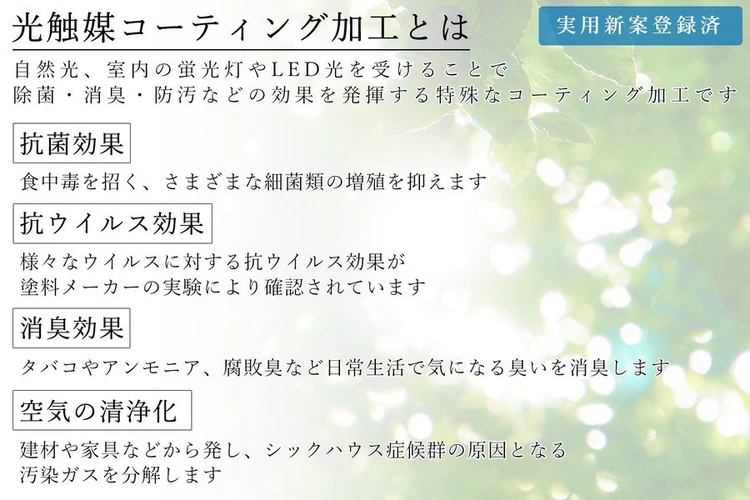 光触媒コーティングを施された製品は、周囲の様々な汚れや臭い、雑菌や細菌などの有害物質を繰り返し分解し、快適な住まいの環境を作ります。そして光が当たり続ける限り、継続してその効果を発揮します。当製品に使用されるコーティング材は、室内照明だけでも高い効果を発する、国内トップメーカー製となっています。