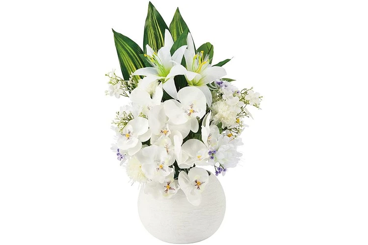 シリーズの中でも一番人気の高い胡蝶蘭の花をメインに、リリーや白菊など純白の花たちが咲き誇ります。そして白く落ち着いた雰囲気、シックな陶器製花瓶に生けられ、LED点灯させない時もお部屋にしっとりと「華」を添えてくれます。