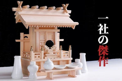 木曽桧の神棚セット。希少な材と優れた木工技術が集約された「木曽桧の神棚」は、職人の技と心意気を感じる工芸品。宮型(お社)と神鏡や陶器など、必要な神具がそろった一式です。